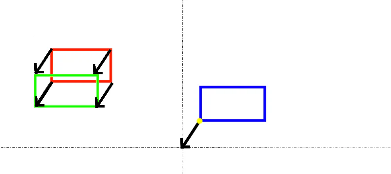 Geometrically, the Minkowski difference of two 2D shapes is the shape produced when you subtract every point on one shape from every point on the other shape. Here’s an example. We’re going to find the Minkowski difference of the blue rectangle and the red rectangle. Let’s do this by corners. We will subtract one corner at a time. Start with subtracting the bottom left corner of the blue from every point on the red. The black vector is the vector we’re subtracting. The green rectangle is the resulting shape.